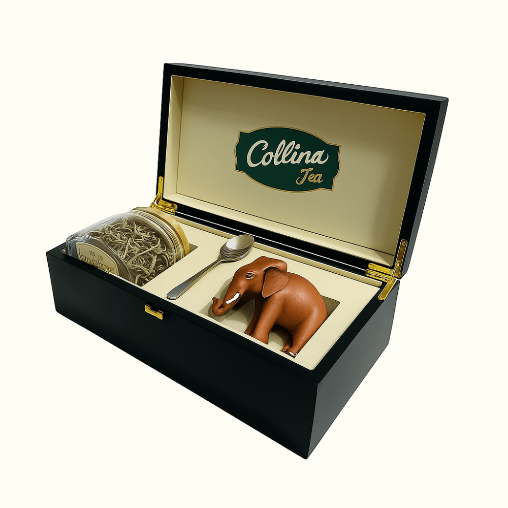 A timeless gift that embodies grace and tradition. This elegant set features a hand-crafted elephant and our finest Silver Tips Ceylon White Tea, delicately packed in a borosilicate glass jar. A beautiful keepsake for tea lovers, symbolizing purity, heritage, and thoughtful gifting.